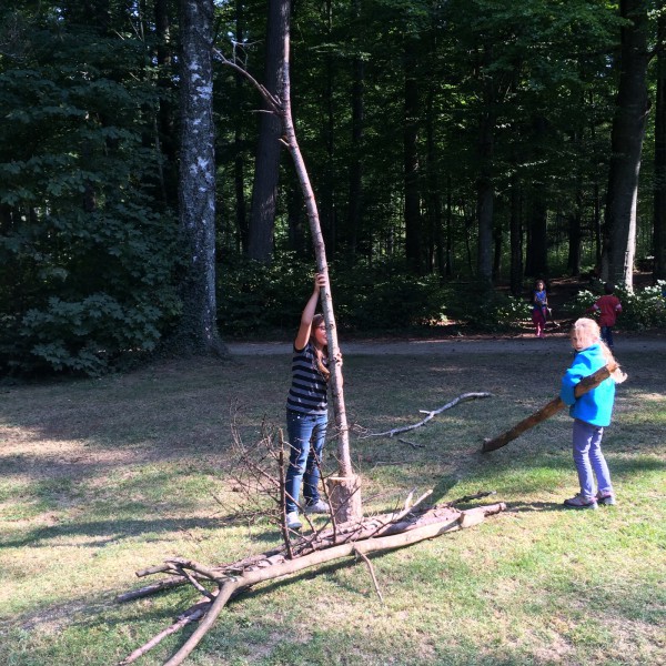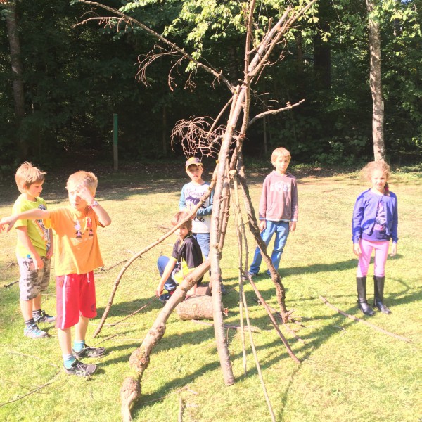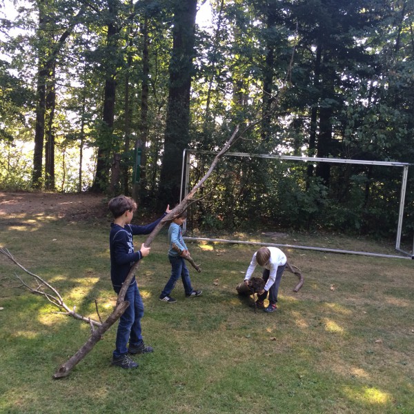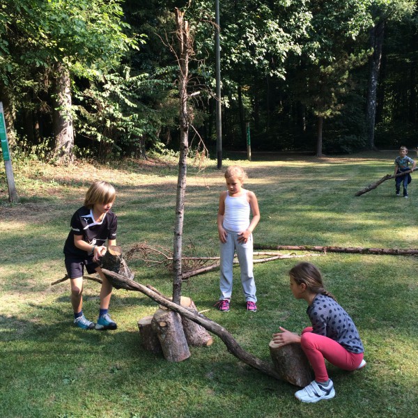Certaines semaines, nous faisons la gymnastique dehors avec nos camarades de 4-5H. Après nous être échauffés, nous avons eu comme mission de réaliser la plus haute tour en bois.