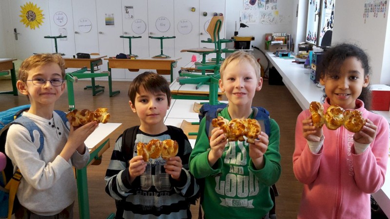 Le matin, nous avons fabriqué une pâte à tresse par groupe de 4.