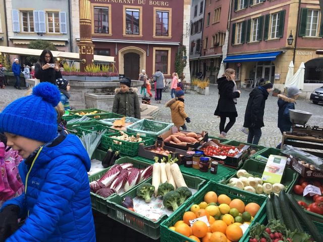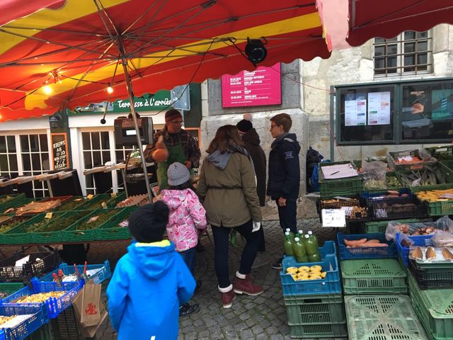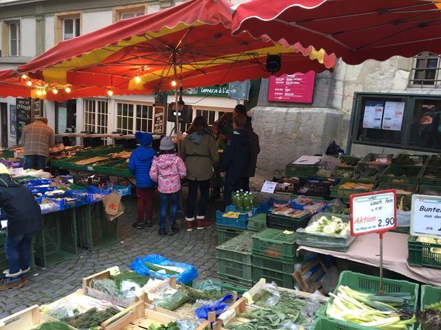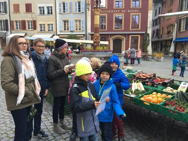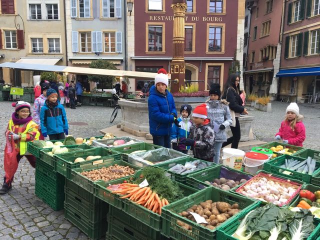 Avec nos filleuls nous sommes allés acheter des légumes au marché à Bienne pour cuisiner une soupe.