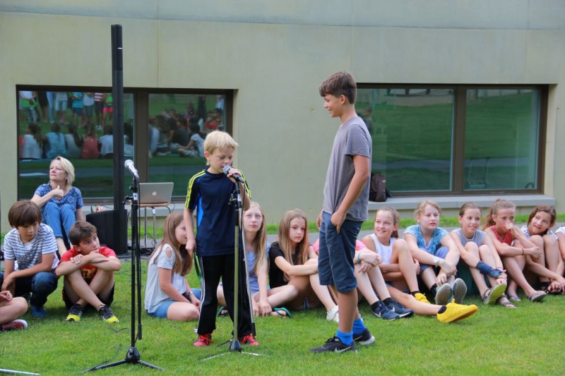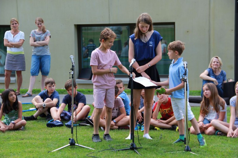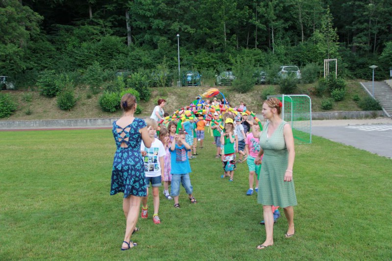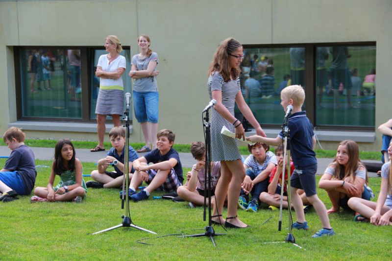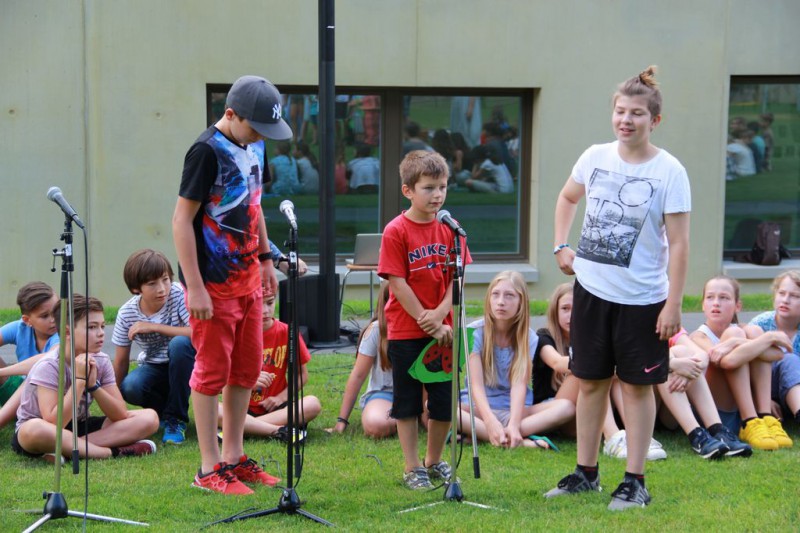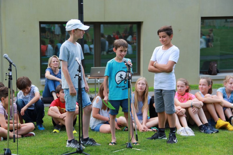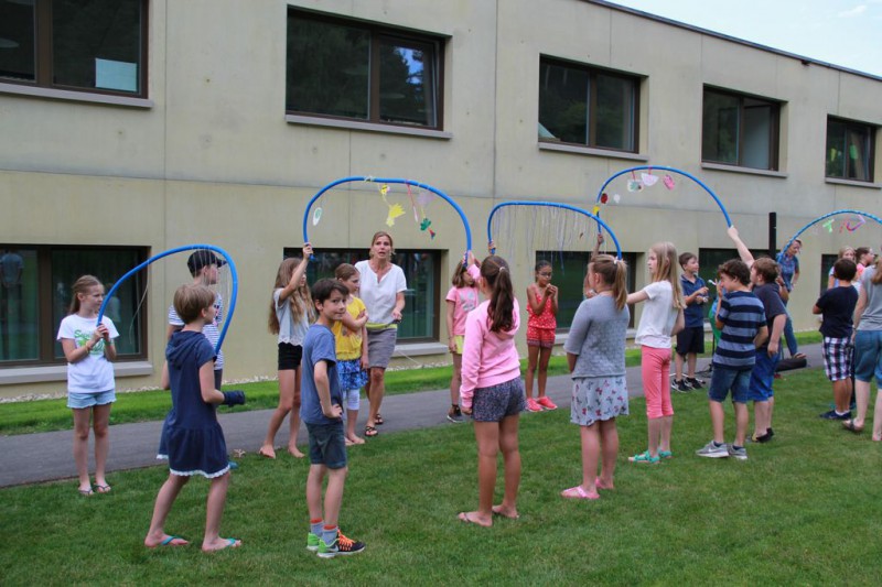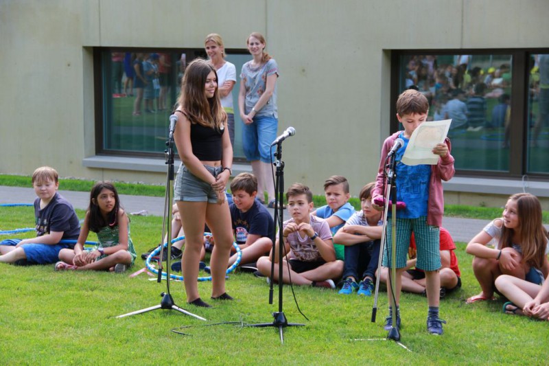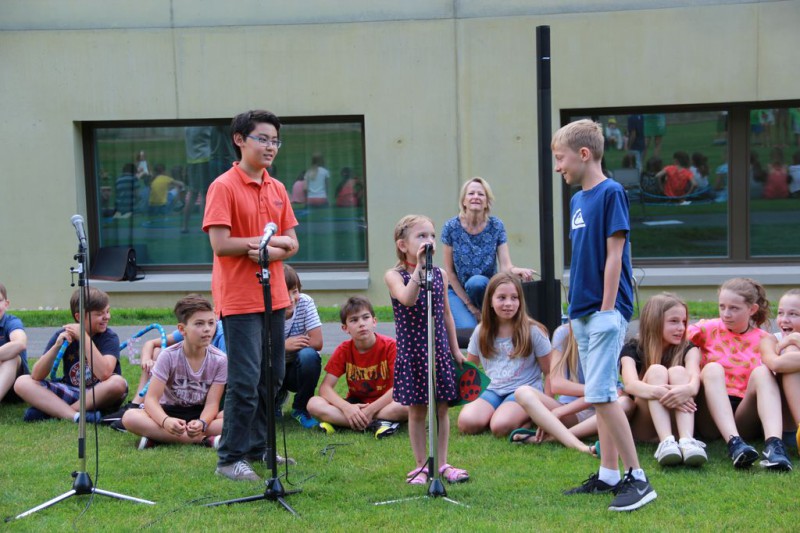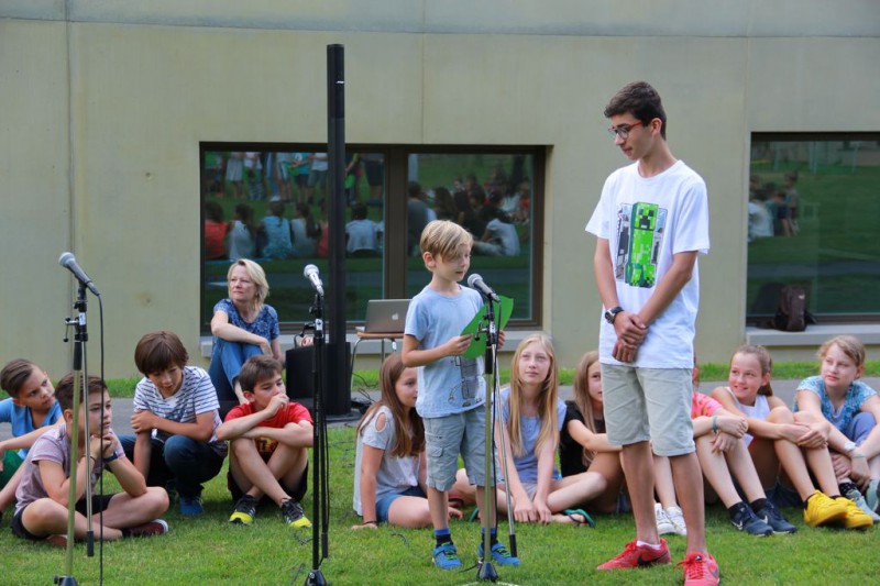 Comme au début de l'année pour accueillir les nouveaux élèves de 3H, nous nous sommes réunis pour souhaiter "Bonne chance" aux 8H qui quittent notre écolepour aller à Bienne.