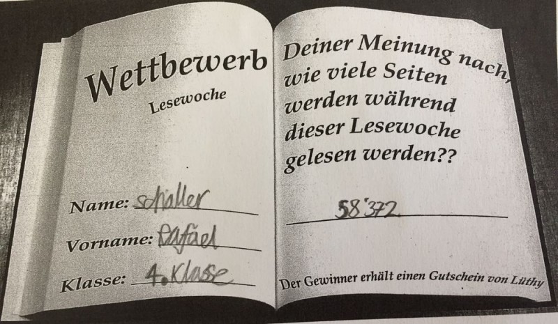 58'690 pages ont été lues durant cette semaine ! Un grand Bravo à Rafaël Schaller dont l'estimation à 58'372 était la plus proche du nombre effectif. Il gagne un bon cadeau à la librairie Lüthy.